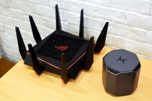 华硕GT-AC5300也毫不示弱,搭载了博通BCM4908处理器,内置核心为四颗1.8GHz Cortex-A53,提供2个5GHz和1个2.4GHz频段,有效保障了游戏的稳定性,另外这款产品更是内置了1GB RAM和256M ROM ,在接口方面也升级到了多达8个千兆LAN口和2个USB3.0接口,在传输速度方面可以说非常强悍。