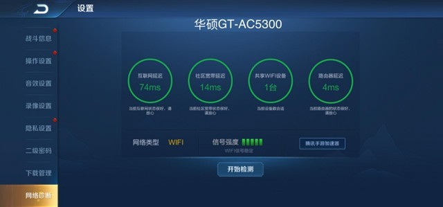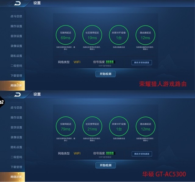 荣耀猎人游戏路由和华硕GT-AC5300的路由器延迟都是12ms,不过这个测试只是“王者荣耀”设置里面的一个网络诊断结果,只能作为参考,那么吖有就玩几局来实测一下吧!