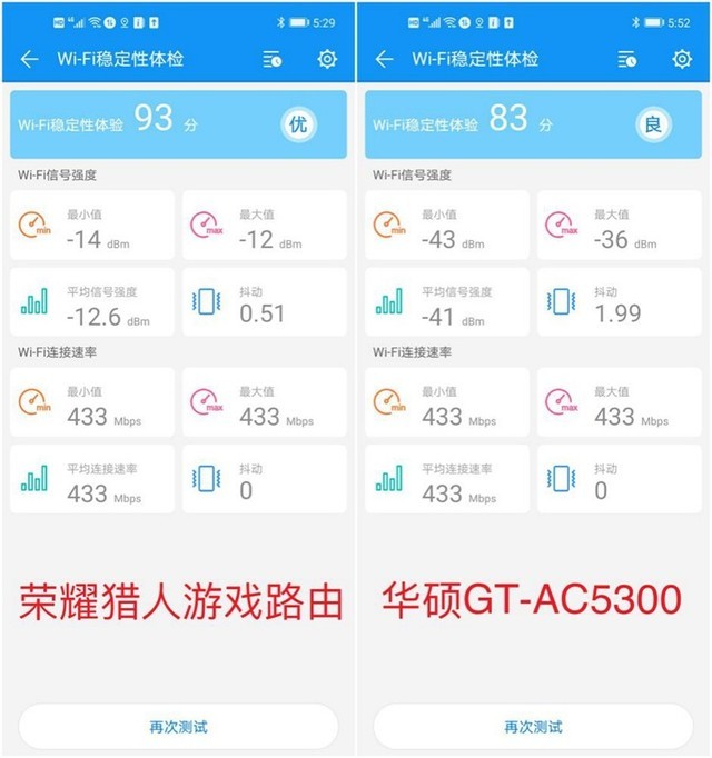 再来看下两款路由的Wi-Fi稳定性体验,将手机放在路由器上直接测试。可以看到,荣耀猎人游戏路由最终的得分为93分,而华硕GT-AC5300最终得分为83分,虽然分数不能很准确的说明路由器的差和好,但是,通过Wi-Fi信号强度的分析可以了解到,这两款路由的差距在哪里。荣耀猎人游戏路由Wi-Fi信号强度最小值-14dBm,很大值-12dBm,平均信号强度-12.6dBm,抖动0.51,而华硕GT-AC5300Wi-Fi信号强度最小值-43dBm,很大值-36dBm,平均信号强度-41dBm,抖动1.99,和荣耀的相比,差距有点大了,我很意外的是,华硕GT-AC5300八根天线的信号强度都敌不过荣耀的六颗独立信号放大器。不过两款产品的Wi-Fi连接速率都一样!