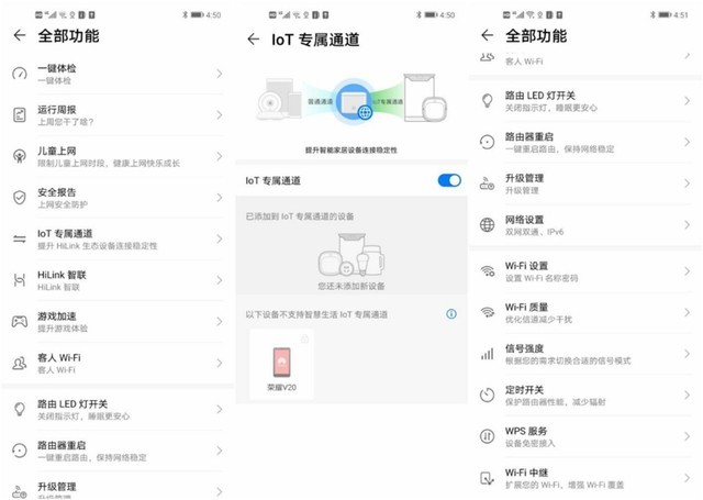 值得一提的是:荣耀猎人路由器可以通过“智慧生活APP“进行管理设置,有个功能非常值得提下,那就是”loT专属通道“,特分配一个独立核做loT加速引擎,为loT设备建立专属Wi-Fi连接通道,让loT设备连接更加稳定,操作响应速度更快。
