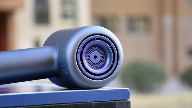 直白高速电吹风的手柄内配置有一个自研的数码马达V-max,直径为29毫米,转速可以达到每分钟10万转以上。马达带动有13片叶轮,采用航空级铝合金材质,每秒钟可以推进约15升左右的增压气流,为吹风机带来强劲的风力。