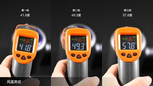 直白高速吹风机还搭配有智能温控系统,每秒50次自动测温自动调控,减少高温对头发的过热损伤。上图为在三个档位下测试出风口的温度,数据看上去没有杀伤力,实际吹发体验也没有烫的感觉,对于高温的伤害,这是它关上的第一扇门。