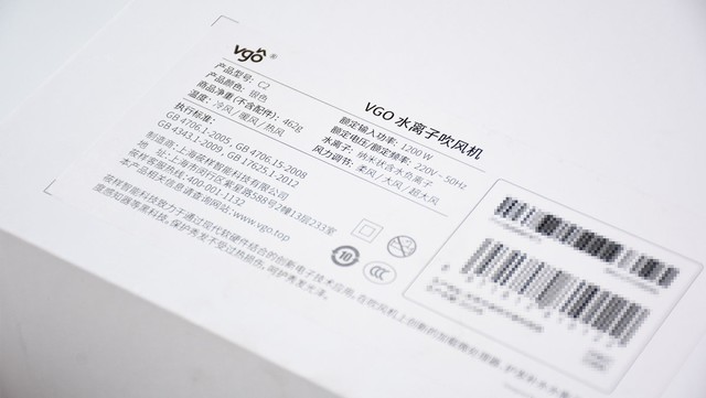 包装侧边印有VGO品牌标识以及产品的Slogan,底部靠近下方的位置贴有一张不干胶铭牌,记录有这台吹风机的技术参数、执行标准以及相关的条形编码。