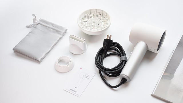 包装内的陈列比较规整,所有物件都收纳在包装模具中,包含有电吹风主机、卷发风罩、高速风嘴、造型风嘴、收纳布袋和使用指南。