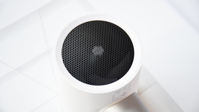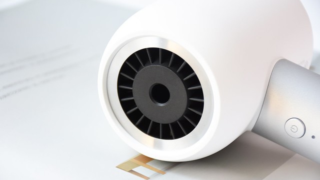 主体部分内侧做了微微收窄的设计,直径略小于外侧。这部分是电吹风的出风口,中间黑色的部分辅以条形纹路处理,外侧镶嵌有一圈银色拉丝质感的圆环,提升产品本身的品质感,有些类似与华为Mate30摄像头周围的圆环。