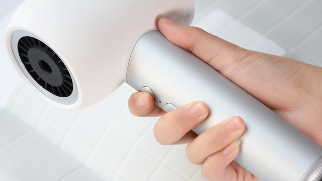 手柄部分内侧靠上的位置依次排布有电源键、指示灯、温度键和风量键,三颗按键的位置分布比较合理,单手握持情况下大拇指刚好处于按键位置,使用时不必特别费力就可以够到。