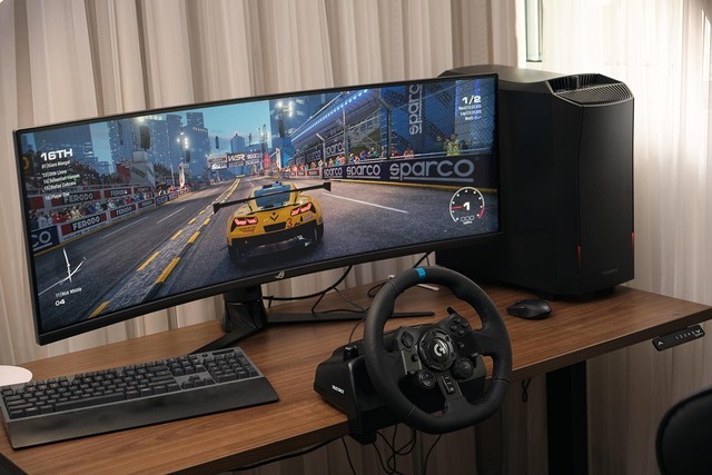 显示器方面,为能更爽的玩赛车游戏,我特意整了个华硕的XG43VQ这个超宽带鱼,43英寸 3840x1200 的32:10的超宽视野,非常适合开第一人称视角来玩,这要比拼接屏幕中间那种大黑边强多了。加上1ms响应和120Hz的刷新率,玩赛车游戏简直可以说是绝配,加上支持TRUEFORCE的3款游戏,基本都不吃什么性能,随便整台电脑就可以在这个准4K分辨率下跑满120帧,配合这个G923简直不要太爽。