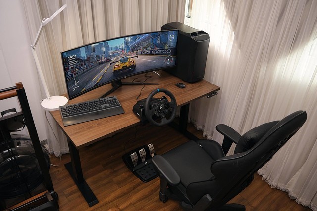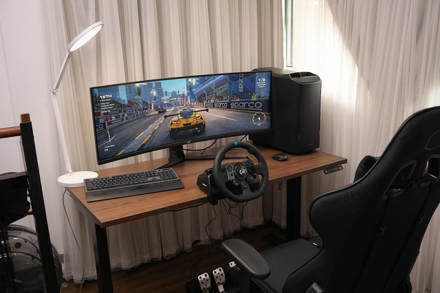 搞专用的方向盘架子肯定是没戏的,老婆大人绝对不会允许我整那玩意放在家里占地方,所以我如果一段时间都会玩它的话,我会把它装在我们家的网易严选的升降桌上,然后把桌子的高度放到最低,然后斜靠在电竞椅上来玩,也很有内味。