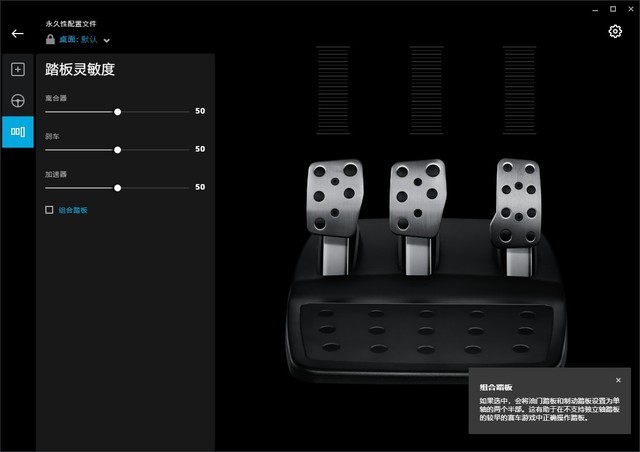 然后就是踏板的灵敏度了,如果是自动挡玩家,建议开启组合踏板,开启后,离合和刹车就变成一个功能了,正好可以缓解我木地板上刹车踩不到底的问题。