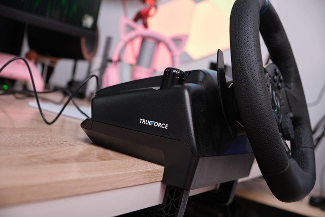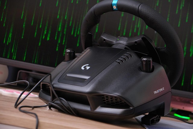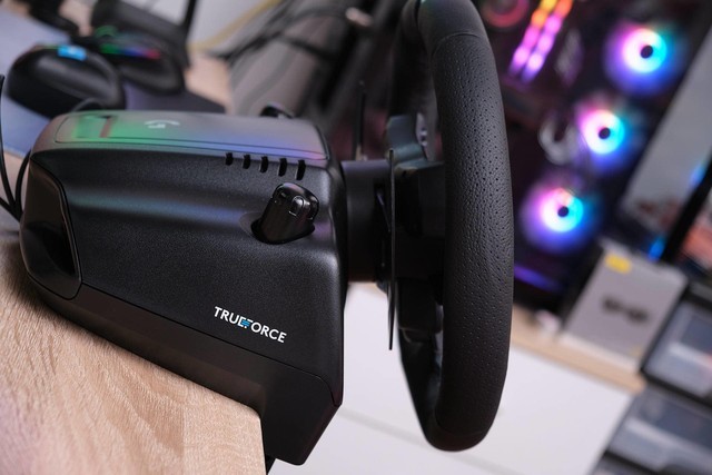 方向盘侧面凸起部分,是用来调整方向盘夹具松紧的,内部有一个暗扣,按下后,就可以锁定了,不用担心被手贱的朋友拧松了。一侧的“TRUEFORCE“logo非常的显眼,这也是G923相比G29最大的不同了吧,这套力回馈系统每秒可以由游戏的物理引擎或是音效进行高达 4,000 次采样,并且将其反应在方向盘的震动上。这让你可以用双手直接感受引擎的震动,或甚至是路面材质的变化,大幅度增加方向盘在触觉上的沉浸感。