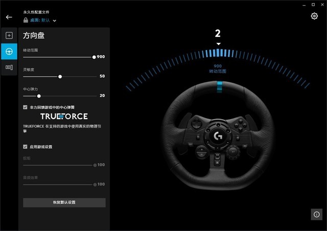如果你是初尝方向盘,可以通过打开右下角的小“i”按钮,开启后,帮助面板会为你解释,你所设置的每一个参数,会影响到什么游戏体验。TRUEFORCE必须得打开,这也是为啥要买这个方向盘最重要的原因嘛,不过比较遗憾的是目前能支持这个功能的游戏还不算太多,目前只有神力科莎竞技版、超级房车赛 2019以及GT赛车 竞速这3款游戏。