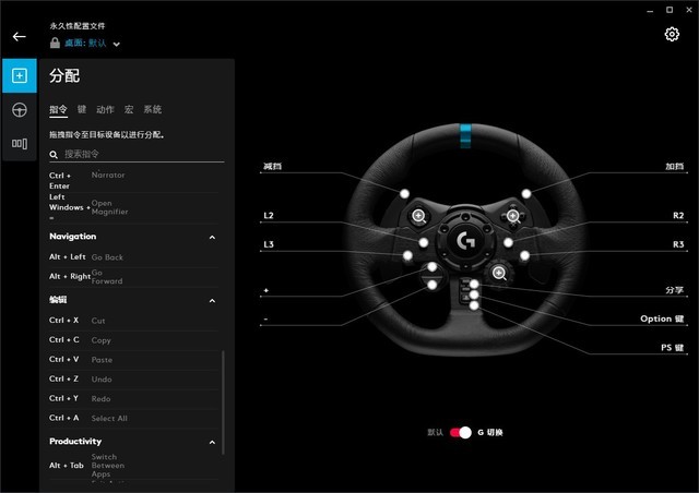 连上电脑之后,就是安装G HUB了,通过驱动,方向盘上所有的按键,我们都可以进行自定义。并且还能为方向盘设置按键宏。