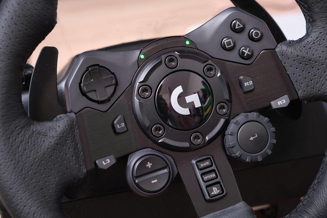 按键设计方面,基本和G29一脉相承,基本上和PS4的按键差不多,看一眼基本就知道啥功能了,比较不一样的就是盘面后方的两块硕大的金属换挡拨片了,触发很清脆,手感很不错,并且它是跟随方向盘一起转动的,可以用来挂挡。