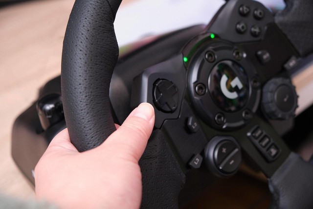 G923的盘面直径为28cm,很接近真车方向盘的尺寸,加上手握处采用了大面积的皮革包裹,让整个方向盘的持握感变得非常棒,非常有内味。方向盘本身由大铝和钢打造,非常的重,给人一种做工很扎实的额感觉,盘面有大量的拉丝和抛光工艺,让方向盘的颜值和耐用性提高了不少。