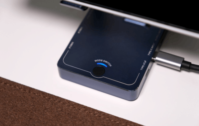 扩展坞的机身正面设有一个Mode Switch按键,用于手机模式和电脑模式之间切换,不同模式,指示灯的颜色也不同,手机模式为蓝灯,电脑模式则是绿灯,方便用户快速区分。
